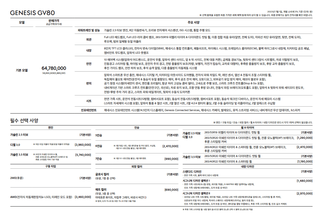 제네시스 SUV GV80은 2023년 기준으로 기본모델의 가격이 아래와 같습니다.