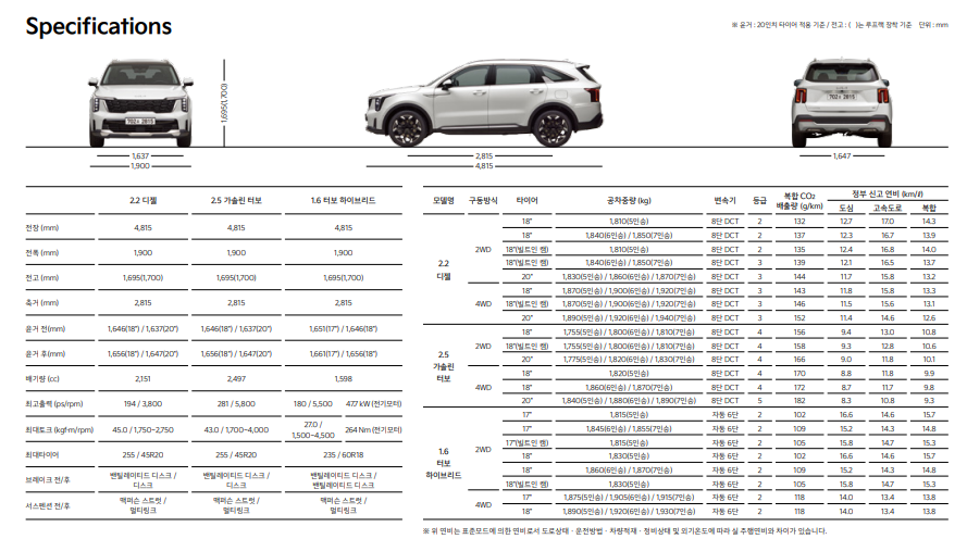 더뉴소렌토 2.2디젤, 2.5가솔린 터보, 1.6 터보 하이브리드 전장, 전폭, 전고등 차체 특징입니다.