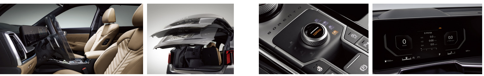 - 터레인 모드 (오토, 스노우, 머드, 샌드): 눈길, 비포장도로, 모래길등 지형조건에 따라 구동력, 엔진토크, 제동 등을 통합 제어하여 최적화된 주행성능을 제공하며 노면 컨디션을 확인하여 안정적 주행을 합니다.